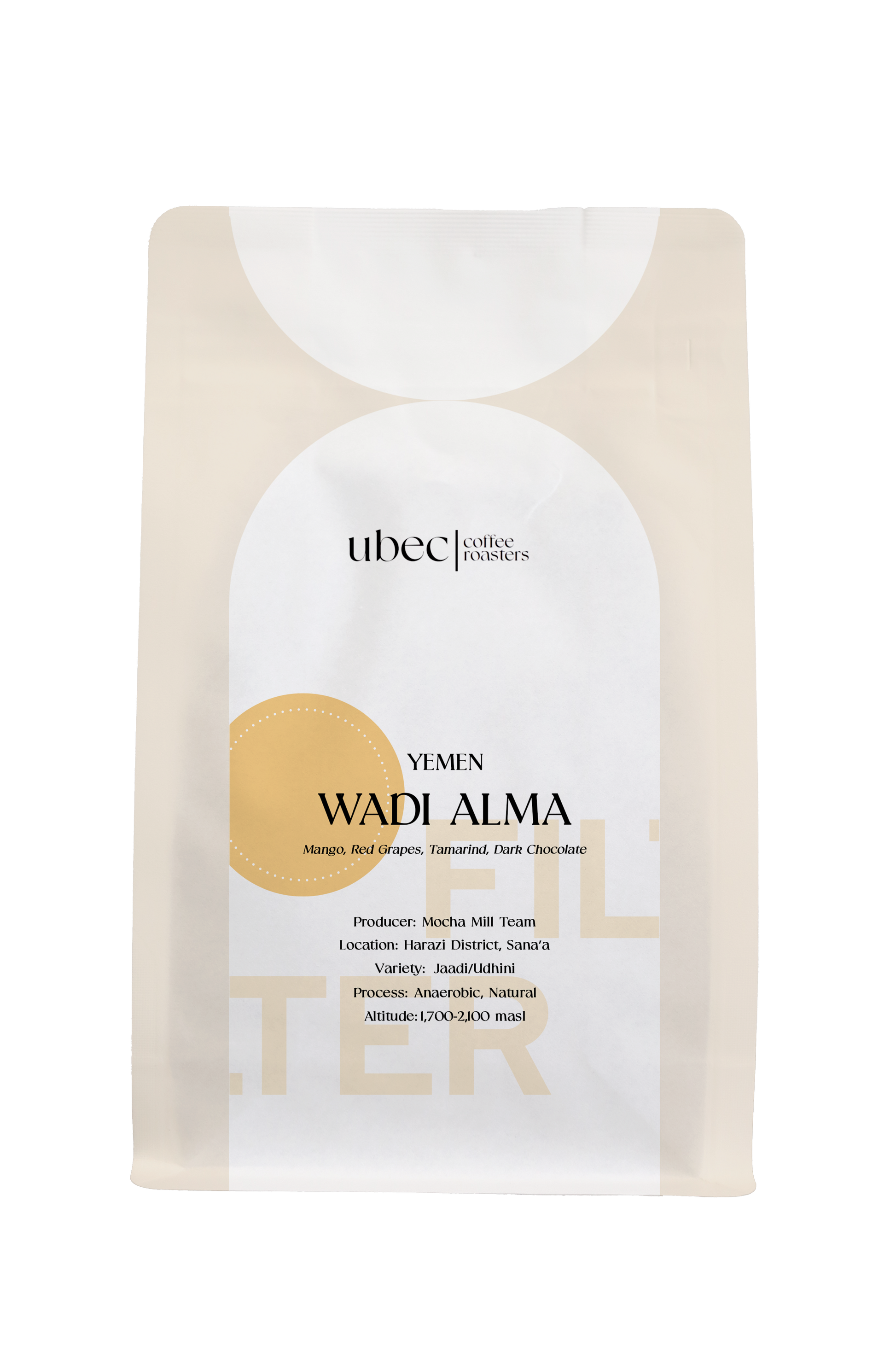 This lot from Wadi Alma represents the perfect meeting of ancient tradition and modern craft. With heirloom Jaadi/Udhini varieties grown in Yemen’s historic coffee heartland, and enhanced through anaerobic natural processing, it delivers a cup that is both rooted in terroir and strikingly contemporary.
